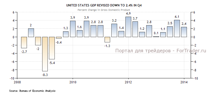 Доллар показал в пятницу максимальное падение за пять недель, потеряв по индексу доллара 0,6%. Согласно пересмотренным данным, темпы роста американской экономики в 4-м квартале замедлились до 2,4%, против первоначальной оценки 3,2% и прогноза 2,5%. Хуже предварительных оценок оказались темпы роста потребительских расходов, товарных запасов и экспорта. JP Morgan понизил прогноз по росту ВВП США в 1-м квартале с 2,5% до 2,0%; Barclays Capital — до 1,8%; Macroeconomic Advisers — до 1,4%. В то же время, индекс деловой активности Chicago PMI и индекс потребительских настроений от Мичиганского университета вышли лучше ожиданий.