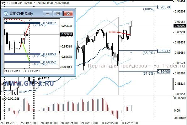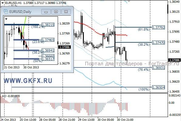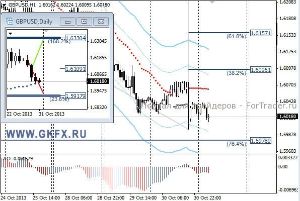 Пара EURUSD снижалась после обнародования заявления ФРС по окончании заседания, которое разочаровало большинство участников рынка считавших, что ФРС выберет более мягкий вариант и не станет в ближайшем будущем сокращать программу QE3. Однако ФРС оставила дверь открытой для начала сокращения программы стимулирования уже в этом году. На основании этого доллар получил поддержку. По рекомендации вторая цель была достигнута. На эту неделю традиционно рассматриваю два варианта возможного движения цены, основной красный и альтернативный зеленый. Значимые уровни на сегодня отмечены на часовом графике. Индикатор АО находится в отрицательной зоне и снижается, указывая на желание пары двигаться вниз. Индикатор тренда указывает на снижение. Преодоление 1,3690 позволит войти в продажи с целью 1,3650.