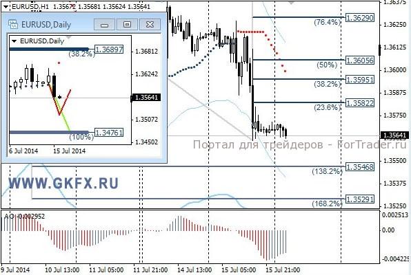 Пара EURUSD снижалась и торговалась с повышенной волатильностью в соответствии с ожиданиями. По Еврозоне выходила слабая статистика, что привело к снижению пары. В результате сделка на продажу была исполнена и первая цель достигнута, что позволило стоп перевести на уровень безубытка. В итоге он и сработал. Впоследствии пара продолжила снижение, но без нас. Также доллар получил поддержку после выступления главы ФРС Йеллен на американских торгах, которая заявила, что процентные ставки могут быть повышены раньше, чем ожидают рынки, если данные из США продолжат улучшаться. Это дает доллару преимущество на этой неделе. На эту неделю традиционно рассматриваю два варианта возможного движения цены, основной красный и альтернативный зеленый. Значимые уровни на сегодня отмечены на часовом графике. Индикатор АО находится в отрицательной зоне и растет, указывая на коррекцию перед возможным продолжением снижения. Индикатор тренда указывает на снижение. Продажи из области 1,3580/90 с целями 1,3560, 1,3547 и 1,3530.