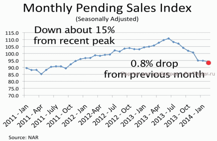 Доллар снизился к фунту и основным сырьевым валютам, но укрепился к евро и швейцарскому франку, прибавив около 0,1% по индексу доллара. Согласно данным Национальной ассоциации риэлторов (NAR), число незавершенных сделок по продаже жилья снизилось в феврале на 0,8% м/м, тогда как изменений не ожидалось. Снижение продаж идет уже восьмой месяц подряд. Индекс незавершенных продаж на вторичном рынке жилья упал до 93,9, с пересмотренного вниз 94,7 в январе. Индекс был на самом низком уровне с октября 2011 года, когда он был 92,2. Рынок жилья продолжает бороться с последствиями необычно холодной погоды и роста ипотечных ставок.