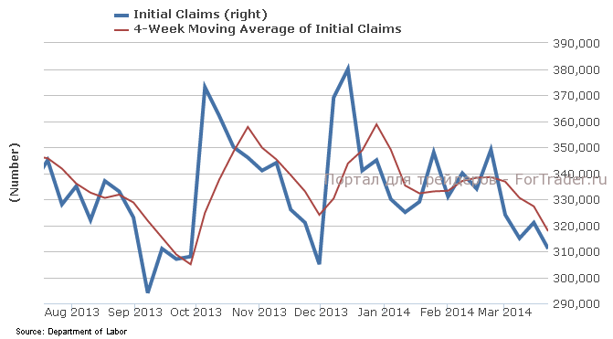 Данные по числу заявок на пособие и на этой неделе снова вышли лучше прогнозов. Число первичных заявок на пособие по безработице в США на прошлой неделе снизилось на 10 тыс. до 311 тыс., тогда как прогнозировался рост заявок до 325 тыс. Среднее число заявок за последние 4 недели продолжило снижение, сократившись на 9,5 тыс., с 327,25 тыс. до 317,75 тыс., это самый низкий показатель с конца сентября прошлого года.