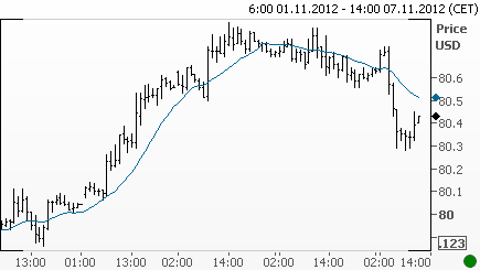 По предварительным результатам прошедших в США президентских выборов Барак Обама, обогнав своего оппонента Митта Ромни, переизбран на второй срок. Реакция рынков не заставила себя ждать. В среду утром доллар США оказался под давлением: индекс валюты, отражающий его динамику против шести основных мировых валют, опустился с отметки 80.7 в район 80.3 (см. график ниже), показав первое в ноябре текущего года существенное падение. Судя по всему, политика низких ставок и возможность дополнительного количественного смягчения со стороны центрального банка продолжат оказывать давление на главную мировую резервную валюту.