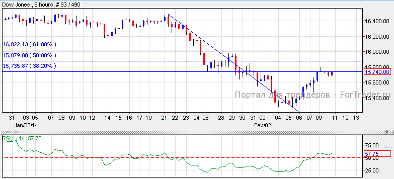 Уолл-стрит завершила торговый день в зеленой зоне после выхода положительных данных о доходах нескольких крупных компаний. S&P 500 вырос на 0.16%, Dow Jones вырос на 0.05%, а NASDAQ добавил к стоимости 0.57%. Согласно техническому анализу 8-часового графика, индекс Dow Jones пытается пробить уровень сопротивления 15,735, который совпадает с первым уровнем коррекции Фибоначчи. Если индекс пробъет уровень сопротивления, он может вырости к отметке 15,840. Индекс относительной силы поддерживает восходящий тренд.