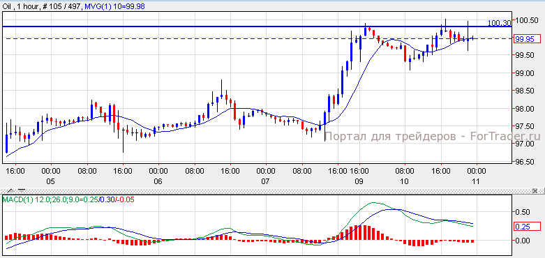 Нефть немного подешевела закрывшись на цене 100 $ за баррель. Согласно техническому анализу 1-часового графика, нефть торгуется ниже уровня сопротивления 100$, и дважды не смогла пробить его. На данный момент импульс может поменяться на нисходящий и негативно повлиять на цену. Индикатор MACD так же говорит об изменении тренда на нисходящий.
