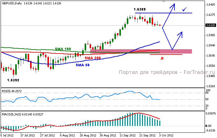 Развитие коррекции продолжается, и по-прежнему не исключен выход к отметке 1.6000. В случае ее преодоления и закрепления ниже коррекция продолжится к 50-дневной SMA, проходящей около 1.5900, или в район 1.5740-1.5780, где сосредоточены 100- и 200-дневная SMA. При этом разворот тренда вверх может состояться от любой из вышеперечисленных поддержек, после чего пара будет нацелена на тестирование сопротивления в районе 1.6300, прорыв выше которого подтвердит развитие среднесрочного восходящего тренда к следующему сопротивлению 1.6620 и ключевому сопротивлению 1.6750.