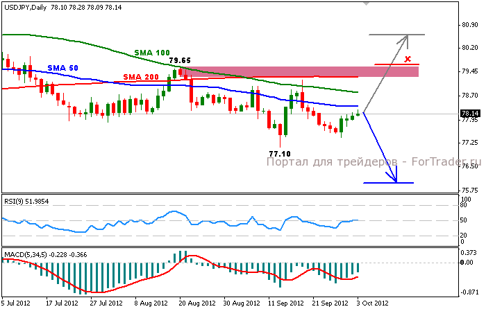 Пара восстановилась в район 50-дневной SMA, проходящей около 78.40. Закрепление выше позволит продолжить восстановление к 100-дневной SMA, проходящей в районе 78.80, а также, вероятно, далее в район 79.30-79.65, где находится 200-дневная SMA. Между тем, пока пара торгуется ниже отметки 79.65, среднесрочные риски остаются понижательными, и разворот тренда вниз может состояться от любого из указанных выше сопротивлений. Целью снижения остается прорыв ниже текущего минимума 77.10 к ключевой поддержке 75.55-76.00. Однако преодоление сопротивления 79.65 улучшит перспективы пары и позволит продолжить рост к сопротивлению 80.60, в свою очередь преодоление которого откроет дорогу дальнейшему восстановлению в направлении отметки 84.00.