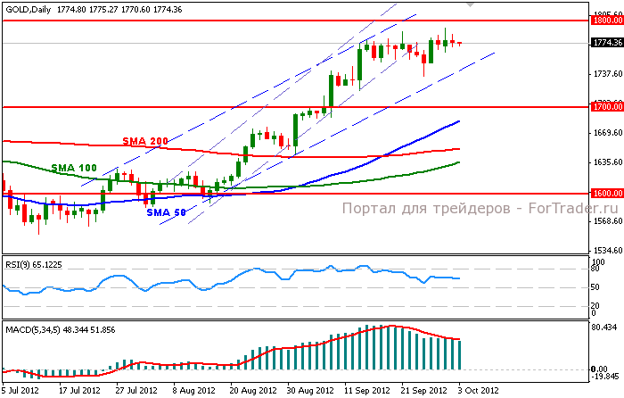 Рост понедельника подтолкнул некоторых инвесторов к фиксации прибыли, что спровоцировало небольшое снижение котировок. В то же время, участники рынка ожидают новых данных, которые поступят позже на этой неделе, и не проявляют склонности к активным действиям. Ключевым является отчет с рынка труда США. Многие ожидают слабых показателей, на фоне которых снижение доллара продолжится. Это должно позитивно сказаться на золоте, поскольку инвесторы покупают этот металл для защиты своих сбережений от риска снижения стоимости валют. Также снижение доллара делает его менее дорогим и более привлекательным для держателей других валют. Однако даже если данные из США не помогут золоту, не ожидается существенного снижения его котировок в условиях чрезвычайно мягкой денежно-кредитной политики мировых ЦБ и неослабевающего долгового кризиса еврозоны. Это поддерживает сильный спрос на металл как средство сбережения и альтернативную валюту.