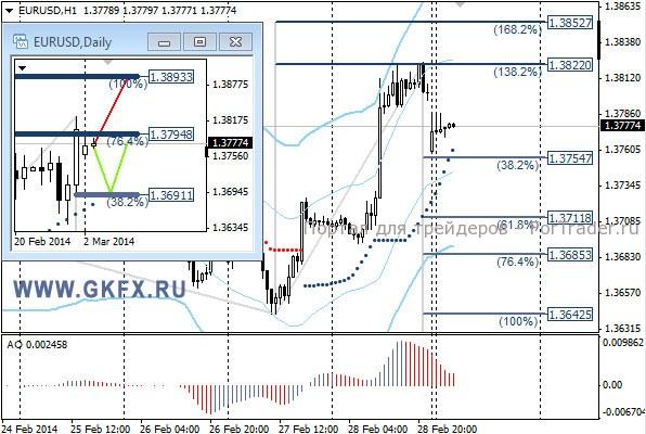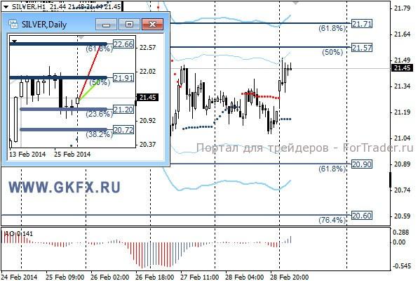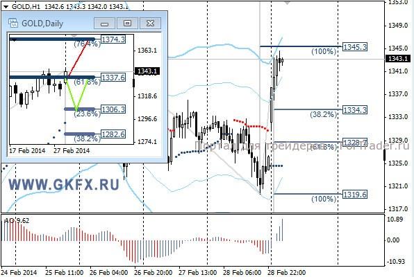 Цены на золото продолжили снижение в пятницу в рамках коррекции. Это позволило выполнить сделку по рекомендации. Достигнута была только первая цель, так как ускорения снижения не последовало. Не смотря на слабую статистику по США, золото продолжило снижаться и подходило к минимумам недели. Однако новая неделя началась резким ростом цен к максимальным отметкам за четыре месяца. Это указывает на возможный рост цен к новым максимумам с сентября-октября 2013 года. Традиционно делаю два варианта движения цены на неделю, основной красный и альтернативный зеленый. Значимые уровни на сегодня отмечены на часовом графике. Индикатор АО находится в положительной зоне и растет, указывая на желание инструмента двигаться вверх в данное время. Индикатор тренда указывает на рост. Сегодня наблюдаем, как поведут себя цены далее.