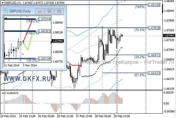 Пара GBPUSD наконец выполнила условие по рекомендации и судя по мелкому графику можно было войти по 1,6707. Обе цели по рекомендации были достигнуты. На прошедшей неделе частично отработался красный вариант движения цены. На эту неделю традиционно рассматриваю два варианта возможного движения цены, основной красный и альтернативный зеленый. Значимые уровни на сегодня отмечены на часовом графике. Индикатор АО находится в положительной зоне и снижается, указывая на коррекцию перед возможным продолжением роста. Индикатор тренда указывает на рост. Сегодня наблюдаем за желанием рынка.
