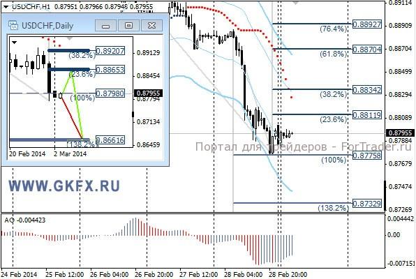 Пара USDCHF в пятницу выполнила обе цели по рекомендации на уровнях 0,8870 и 0,8855, если стоп на уровне 0,8890 не сорвало. На прошедшей неделе отработался красный вариант движения цены. На эту неделю традиционно рассматриваю два варианта возможного движения цены, основной красный и альтернативный зеленый. Значимые уровни на сегодня отмечены на часовом графике. Индикатор АО находится в отрицательной зоне и растет, указывая на коррекцию перед возможным продолжением снижения. Индикатор тренда указывает на снижение. Сегодня наблюдаем за желанием рынка.