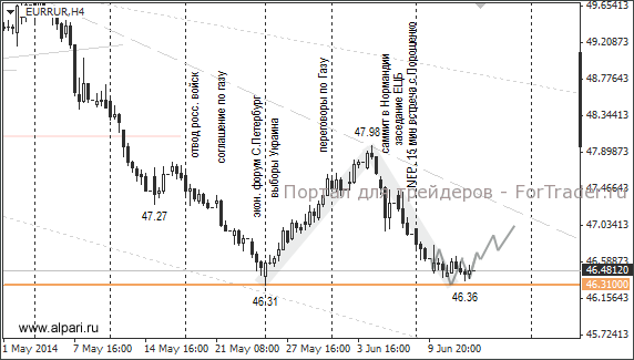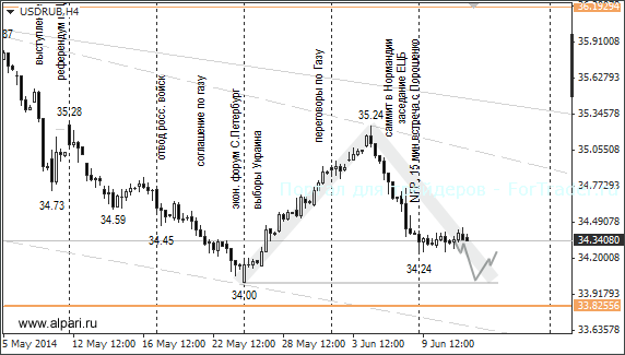 Если ожидания с ростом по евро/доллару оправдаются, то евро/рубль оттолкнётся от поддержки 46,31-46,36. Если ценовую модель с основаниями 46,31 и 46,36 принять за «двойное основание», то по ней рубль снизится как минимум до 47 рублей. Через этот уровень проходит трендовая линия. Закрепление пары за ценовым уровнем 47 откроет евро дорогу на 47,98. Что касается доллара против рубля, то курс доллар/рубль может не дойти до 34 рублей, но ещё способен снизиться до 34,15. По случаю праздника 13 июня не будут проводиться торги по USDRUB_TOD и EURRUB_TOD.