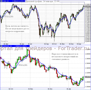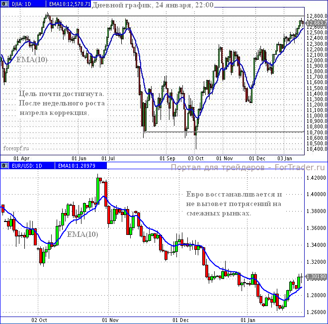 Индекс Доу-Джонса уже преодолевал уровень 12 700 и совсем близок к ближайшей цели 12 800, соответствующей апрельскому максимуму. Однако после недельного роста вполне естественна небольшая коррекция. Во вторник, 24 января, в начале торговой сессии индекс резко ушёл вниз, на дневном графике практически достиг скользящего среднего ЕМА(10), рисующего линию восходящего тренда, после чего довольно активно направился вверх. Вполне естественное поведение, предполагающее, что цель 12 800 будет достигнута.