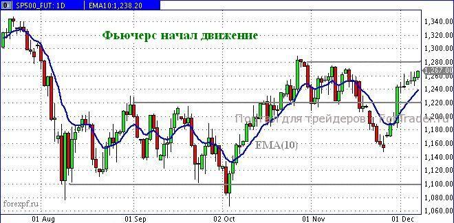 После резкого скачка вверх на прошлой неделе, индекс Доу-Джонса в растерянности замер на несколько дней. Во вторник, 6 декабря, рынок, кажется, успокоился и выбрал направление очередного движения: очень медленно, но цены всё же пошли вверх. В среду продолжил рост и фьючерсный контракт на индекс S&P. На его дневном графике ближайшее сопротивление 1280 просматривается на уровне октябрьского максимума. Вблизи него возможны продажи, что задержит рост рынка. Более дальняя цель соответствует апрельскому максимуму 1360 и вполне достижима.