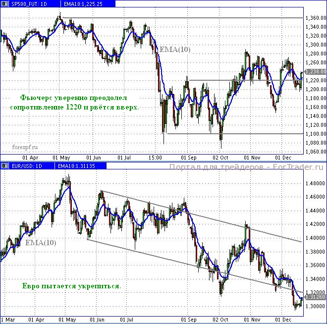 На фондовом рынке произошло значимое событие: во вторник, 20 декабря, фьючерсный контракт на индекс S&P успешно преодолел уровень сопротивления 1220 и в среду продолжил рост. Можно надеяться, что рынок выбрал направление и будет расти. Сдерживающим фактором выступает приближающийся праздник, перед которым возможны продажи.