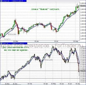 2 августа, в день принятия решений о долге США, индекс Доу-Джонса опустился до уровня поддержки 11 900, соответствующего июньскому минимуму. С технической точки зрения, это была ключевая точка для планирования торговых операций, и можно было ожидать отскока вверх с ближайшей целью у скользящего среднего ЕМА(10), рисующего на дневном графике линию нисходящего тренда. В среду, 3 августа, вблизи поддержки происходила борьба покупателей с продавцами: «медведи» организовали атаку, но «быки» её успешно отбили, закрыв сессию практически на цене открытия. На графике возникла модель «волчок», отражающая царящие на рынке сомнения. Доу упал, участники торгов засомневались, стоит ли идти ниже, казалось бы, пора разворачиваться вверх. Однако в четверг «медведи» провели сокрушительную атаку и опустили индекс Доу сразу на 500 пунктов – своего рода рекорд за последний год. В пятницу продавцы снова пытались продавить рынок, но их атака была отбита: Доу в очередной раз закрылся практически по цене открытия.