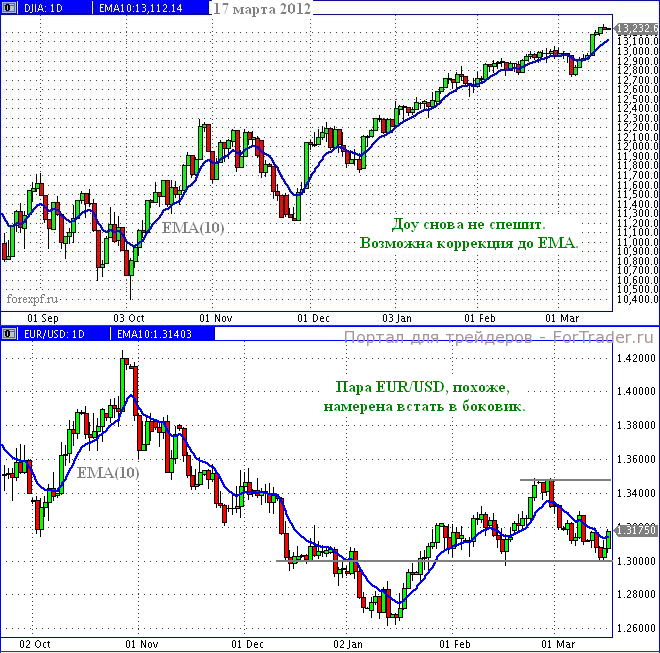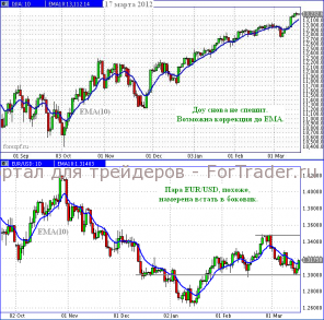 На дневном графике индекса Доу-Джонса явно просматривается восходящая тенденция. Цель по-прежнему просматривается на уровне докризисных значений 14 000. В текущий момент свечи ушли вверх от скользящего среднего ЕМА(10), рисующего линию тренда. И хотя это расстояние не слишком велико, на пассивном рынке вполне возможна небольшая коррекция до линии тренда. С этой точки зрения, с покупками следует быть осторожными.
