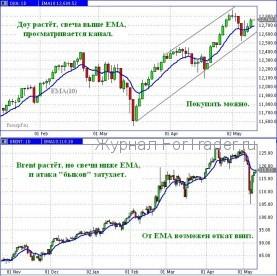 На дневном графике индекса Доу-Джонса просматривается восходящий канал, от нижней границы которого ещё на прошлой неделе Доу начал расти, причём достаточно уверенно. Во вторник, 10 мая, дневная свеча ушла выше скользящего среднего ЕМА(10), что обещает дальнейший рост. Аналогичная картина просматривается и на дневном графике фьючерсного контракта на индекс S&P. Однако, после заметного роста во вторник, ночью фьючерс замер, а в среду к полудню началась естественная коррекция, увлекающая за собой остальные рынки. Скорее всего, она окажется краткосрочной, и фьючерс на S&P снова двинется вверх.