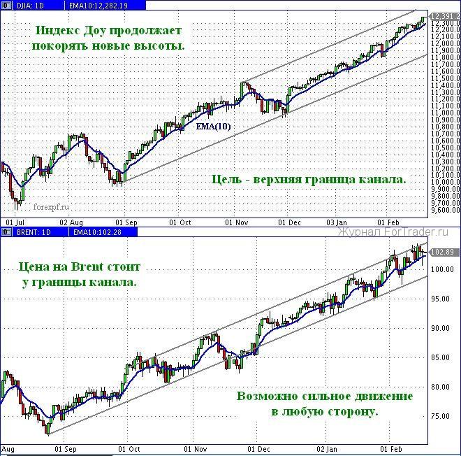На американском фондовом рынке принципиальных движений не произошло. Индекс Доу-Джонса спокойно движется к верхней границе канала, просматривающегося на дневном графике. Во вторник, 15 февраля, произошла естественная коррекция до скользящего среднего ЕМА(10), после чего рост продолжился, и Доу готов покорить новую высоту 12 400. После трёхдневного роста вполне может произойти очередная небольшая коррекция до скользящего среднего с последующим продолжением восходящего движения. Некоторые опасения вызывает только длительность последнего растущего тренда: Доу стремится вверх два с половиной месяца, пора бы и корректироваться. Тем не менее, верхняя граница канала находится не слишком далеко и вполне достижима, скажем, за три недели.