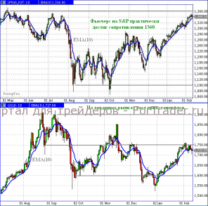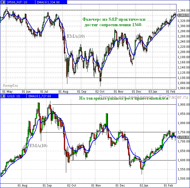 Фьючерсный контракт на индекс S&P всю неделю мелкими шажками двигался к цели 1 360, соответствующей апрельскому максимуму. В пятницу, 10 февраля, произошла естественная после роста коррекция: цена падала практически целые сутки и только в конце американской сессии немного откатилась вверх. На дневном графике фьючерса цена упала точно до скользящего среднего ЕМА(10), рисующего линию текущего тренда, и тут же на арену вышли «быки». Абсолютное торжество технического анализа! Между сопротивлением 1 360 и линией ЕМА умещается всего одна свеча среднего размера. С этой точки зрения можно говорить, что фьючерс добрался до ключевой точки, догнав тем самым индекс Доу-Джонса. На дневном графике Доу целую неделю стоит на уровне сопротивления 12 800. Его значения менялись в пределах 12 800 – 12 900, что соответствует длине одной дневной свечи. Если у фьючерса на индекс S&P ещё есть какое-то пространство для движения, то Доу находится в состоянии неустойчивого равновесия. Любая новость может послужить стимулом для движения в ту или иную сторону. Например, вполне вероятно движение вверх к докризисным значениям индекса, то есть до уровня 14 000.