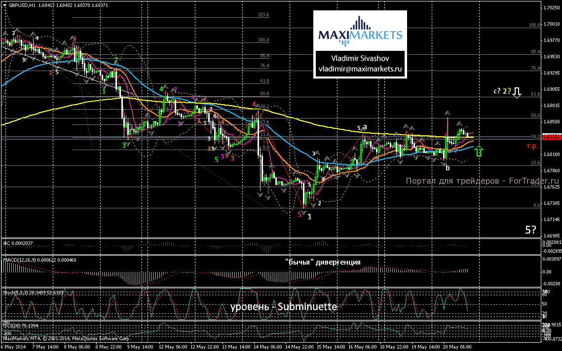 В нашем прогнозе на сегодня предполагаем попытку пары протестировать на подъёме уровень вчерашнего максимума 1.6864 и, если удастся, — преодолеть сопротивление продавцов, продолжить восходящую коррекцию пары и завершить подъём вблизи значимого уровня сопротивления 1.6890. Далее ожидаем возобновления нисходящего движения британской валюты к следующим целевым уровням: 1.6835. 1.68, 1.6782, 1.6758 и, возможно, ниже, к ценовому уровню 1.6731.