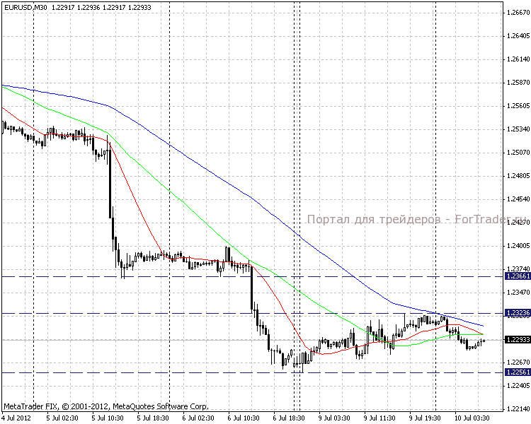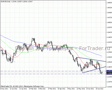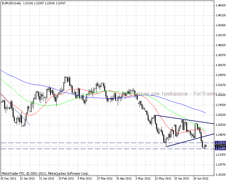 На международном валютном рынке торги по EUR/USD приводят к дальнейшему снижению курса, на вчерашней сессии был обновлен минимум, который зафиксировался на отметке 1,2255. На сегодняшний день многие инвесторы опасаются очередного роста доходности испанских 10-ти летних долговых бумаг выше отметки в 7%.