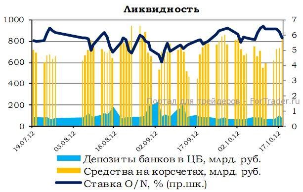 Средства на корсчетах банков  выросли  на  57,1  млрд. руб., депозиты в ЦБ увеличились на 11,1 млрд. руб. Ставка овернайт снизилась на 60,00 б.п. и составляет 5,7900 п.п.