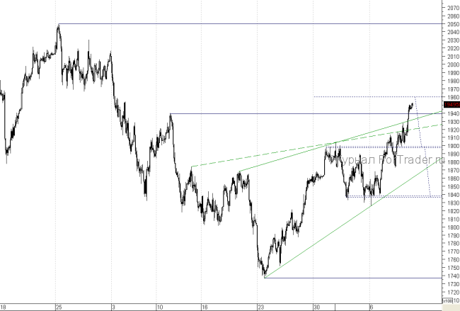 Сегодня ожидается слабонегативное открытие торгов на срочном рынке и дальнейшая динамика фьючерса на индекс РТС будет смешанной в ожидании продолжения крупных покупок отечественных акций. Переставший реагировать на внешние раздражители отечественный рынок пробил все ближайшие сопротивления и теперь имеет два пути – либо реализовывать вертикальный рост, либо отправиться тестировать бывшие уровни сопротивления. Ближайшее предполагаемое сопротивление на пути к основной цели среднесрочного роста, начавшегося вчера, пролегает на отметке 196 000. Целью же роста является 205 000. Ближайшая основная поддержка расположена на отметке 190 000, именно она будет ключевой в случае снижения фьючерса на индекс РТС.