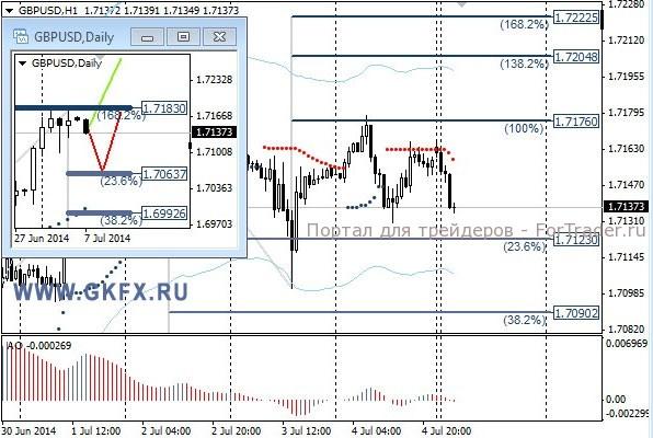 Пара GBPUSD совершала попытки преодоления уровня 1,7175 для входа в покупки. Однако рынок пока, по-видимому, не готов продолжить рост пары. Вероятней всего дальнейший рост не имел продолжения из-за праздников в США. На этой неделе по Великобритании выходит достаточно статистики, чтобы столкнуть пару с места. На эту неделю традиционно рассматриваю два варианта возможного движения цены, основной красный и альтернативный зеленый. Значимые уровни на сегодня отмечены на часовом графике. Индикатор АО находится у нуля, указывая на неопределенность. Индикатор тренда указывает на снижение. Преодоление 1,7175 позволит купить с целями 1,7200 и 1,7220.