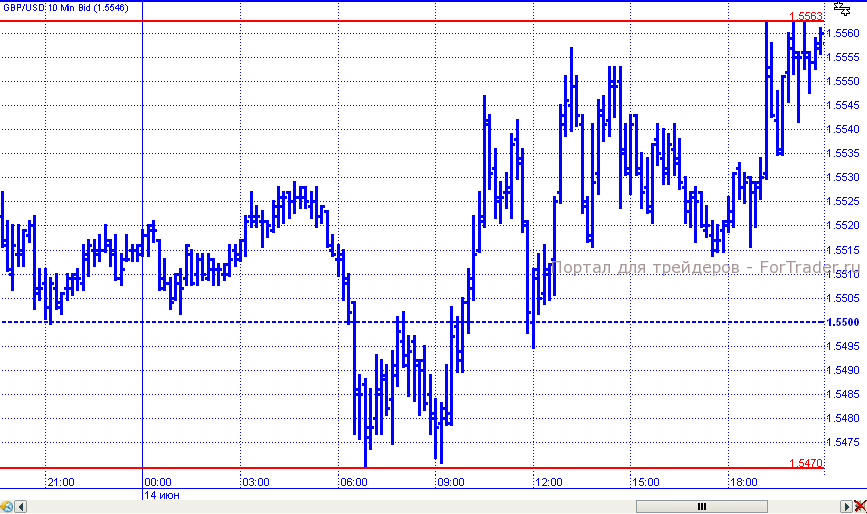 Торговые сутки в четверг пара начала выше уровня 1,5500. Но впоследствии все же на короткое время закрепилась ниже указанной отметки и достигла внутридневного минимума на 1,5470. Невозможность пройти этот барьер спровоцировала возобновление роста. К завершению торгового дня цены преодолели сопротивление 1,5550 и закрылись на отметке 1,5560.