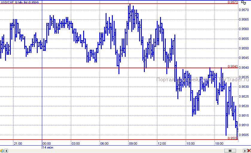 Пара доллар/франк традиционно в зеркальном отражении повторила движения евро/доллара. Торговые сутки цены начали в пределах узкого диапазона 0,9540 – 0,9573. Однако, после того, как евро начал набирать обороты, доллар сдал позиции и по отношению к франку. Цены преодолели отметку 0,9540 и продолжили падение к поддержке 0,9500, в районе которой и завершили день.