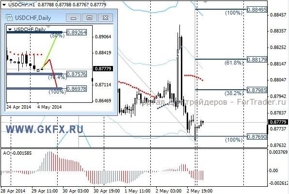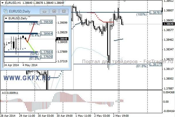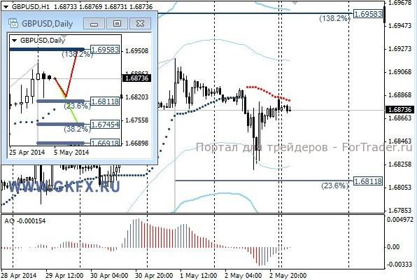 Пара EURUSD совершала резкие колебания после публикации данных по рынку труда в США. Первой реакцией на очень сильные данные был рост американской валюты. Впоследствии новости из Украины развернули рынок, и пара установила новые внутридневные максимумы. Внимание вновь переключилось на Украину из-за обострения ситуации. На дневном графике отработал красный вариант движения цены. На эту неделю традиционно рассматриваю два варианта возможного движения цены, основной красный и альтернативный зеленый. Значимые уровни на сегодня отмечены на часовом графике. Индикатор АО находится в положительной зоне и снижается, указывая на коррекцию перед возможным продолжением роста. Индикатор тренда указывает на рост. Сегодня наблюдаем за желаниями рынка.
