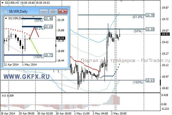 Цены на серебро даже не успели установить новых минимумов недели на сильных данных по США, как золото и направились вверх. Возможно, на этой неделе по серебру удастся забрать прибыль, так как оно начало двигаться более активно, чем ранее. На дневном графике отработал частично красный вариант движения цены. Традиционно делаю два варианта движения цены на неделю, основной красный и альтернативный зеленый. Значимые уровни на сегодня отмечены на часовом графике. Индикатор АО находится в положительной зоне и растет, указывая на желание инструмента двигаться вверх в данное время. Индикатор тренда указывает на рост. Сегодня наблюдаем за желаниями рынка.
