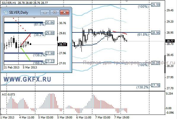 Цены на серебро вновь торговали в диапазоне предыдущего дня. Это указывает на продолжение консолидации. Сегодня по серебру можно попытаться продать и от того какие выйдут данные по США будет зависеть заработает серебро или золото. Стопы меньше профита, поэтому при любом направлении драгметаллов мы будем в плюсе. Есть и худший вариант, но будем надеяться, что он не реализуется. На дневном графике делаю два варианта движения цены на неделю, основной красный и альтернативный зеленый, склоняюсь к красному. Значимые уровни на сегодня отмечены на часовом графике. Индикатор АО в отрицательной зоне и снижается, указывая на желание инструмента снижаться. Индикатор тренда указывает на снижение, но его сейчас можно не смотреть. Sell 28.90 со стопом 29,20. Цель 28,00.