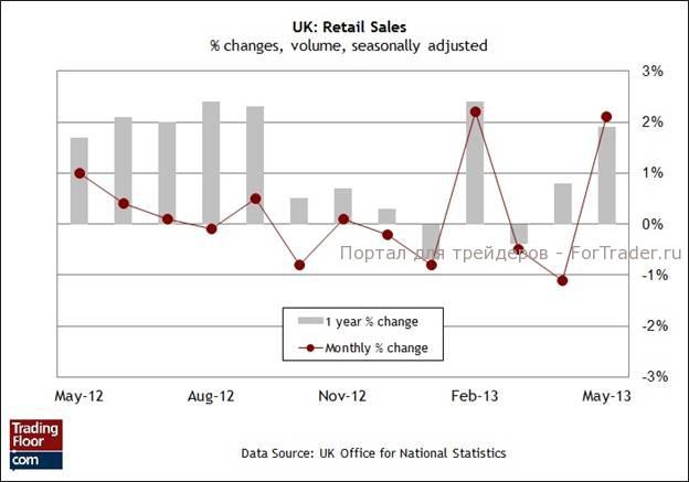 Вчерашняя новость о том, что количество заявок на пособие по безработице в июне сократилось восьмой месяц подряд, служит дополнительным доказательством того, что экономика Великобритании восстанавливается и может показать более высокие темпы роста во второй половине 2013 года и далее. Именно поэтому участники рынка будут внимательно изучать сегодняшний отчет о розничных продажах за июнь. Главный вопрос, который их интересует: оказывает ли падение числа новых безработных положительное влияние на потребительские расходы?