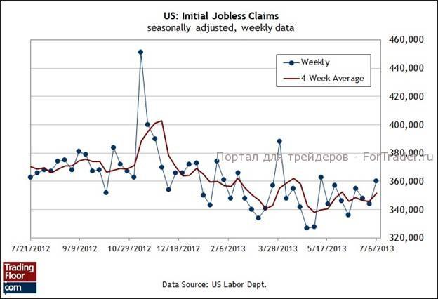 Сегодняшний отчет о новых заявках на пособия по безработице за прошлую неделю будет толковаться в контексте вчерашней новости о резком сокращении нового жилищного строительства в июне. Есть опасения, что восстановление жилищного сектора сбавляет обороты, из-за чего может пострадать вся экономика. Но строить такие предположения пока рано. Целый ряд экономических индикаторов продолжает демонстрировать положительную динамику, начиная с важнейшего рынка труда в США, где занятость в частном секторе показывает непрерывный умеренный рост.