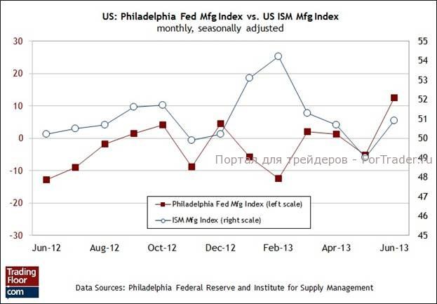 Региональные данные могут лишь ограниченно применяться для определения общенационального тренда, но это не значит, что они бесполезны. Напомним, что рост индекса ФРБ Филадельфии в июне совпал с похожим ростом производственного индекса ISM, который отражает настроения в этом секторе в США в целом. Хотя аналитики ожидают сегодня небольшой коррекции, если общий индекс ФРБ Филадельфии останется в районе отметки 10 (согласно прогнозам), то появится повод надеяться на то, что июльский показатель индекса ISM (выходит 1 августа) удержится выше уровня 50. Именно на это указывал другой региональный отчет о производственном секторе, опубликованный ранее на этой неделе. В понедельник мы узнали о том, что индекс ФРБ Нью-Йорка повысился сильнее, чем ожидалось, и установил пятимесячный максимум. Если только сегодня индекс ФРБ Филадельфии резко не ухудшится, то можно будет рассчитывать на то, что следующий релиз по индексу ISM порадует «быков».