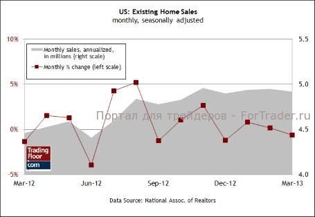 Тем не менее, аналитики ожидают сегодня благоприятных результатов. Средний прогноз предусматривает рост продаж на рынке вторичного жилья в апреле до психологически важной отметки в 5 млн единиц (в годовом выражении с учетом сезонных факторов) впервые за последние более чем 3 года. Действительно, зафиксированный в прошлом месяце прирост новых разрешений на строительство жилья указывает на то, что жилищный сектор все еще может надеяться на улучшения, несмотря на нестабильные данные о новых закладках под строительство за апрель. В этом случае сегодняшний отчет о продажах на вторичном рынке может дать новый повод для оптимизма.