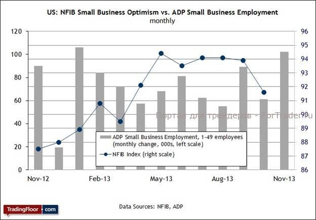 Теперь, когда конфликт хотя бы на время разрешился, означает ли это, что можно ожидать восстановления показателей в ноябрьском отчете? Согласно среднему прогнозу экономистов, да, можно. Ожидается, что на смену пессимистичному настроению в октябре придет порция оптимизма, и значение индекса повысится с 91,6 до 92,4. Едва ли это можно назвать существенным восстановлением, но стабильность в динамике этого индикатора настроений в секторе малого бизнеса очень важна. Если прогноз сбудется, то строить оптимистичные ожидания в отношении следующего отчета станет легче. Согласно опубликованному на прошлой неделе отчету о занятости от ADP, показатель занятости в секторе малого бизнеса в ноябре улучшился.