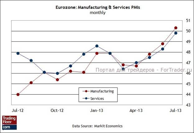 Игроки будут внимательно следить за результатами публикуемых сегодня предварительных оценок индексов PMI в производственном секторе и секторе услуг за август в поисках подтверждения того, что рецессия в Европе закончилась. Когда на прошлой неделе стало известно, что рост ВВП во втором квартале превзошел ожидания аналитиков, планка ожиданий повысилась. Конечно, рост на 0,3% едва ли можно назвать впечатляющим, но первое положительное квартальное изменение за период более одного года вселяет надежду на то, что спад остался в прошлом. На самом деле, говорить об этом пока рано. Один отчет о росте ВВП, которые еще несколько раз будет пересматриваться, вряд ли можно назвать убедительным доказательством того, что экономический цикл развернулся. С другой стороны, согласно прогнозам, предварительные данные PMI за этот месяц могут послужить дополнительным аргументом в пользу того, что за положительным изменением во втором квартале последуют не менее благоприятные новости в третьем квартале.