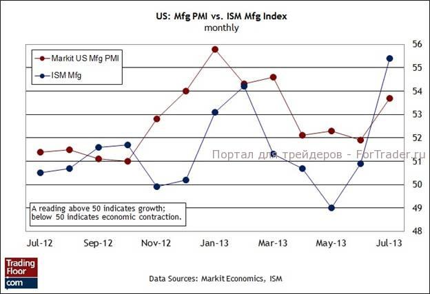 Средний прогноз предусматривает очередное улучшение предварительных оценок по обоим индексам – в производственном секторе и секторе услуг. Судя по статистике, публикуемой в последнее время, такие ожидания вполне оправданы. В предыдущих четырех отчетах мы могли наблюдать позитивную тенденцию в обоих индексах. Если в сегодняшнем отчете восходящая тенденция продолжится, то можно будет с большей уверенностью утверждать, что воодушевляющие результаты роста ВВП во втором квартале служат достоверным признаком того, что экономический цикл, наконец-то, развернулся и взял курс на рост.