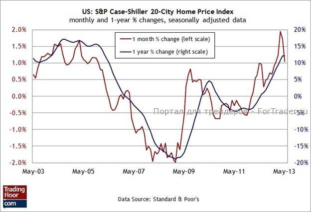 Аналитики полагают, что в июне нас ждет очередной прирост. Консенсус-прогноз предусматривает повышение цен на основании индекса цен на жилье в 20 городах по сравнению с предыдущим месяцем на один процент, а по сравнению с аналогичным периодом прошлого года – на 12,2%. Оба прогноза соответствуют значениям прироста в мае. С другой стороны, в мае темпы месячных изменений значительно уменьшились по сравнению со стремительным ростом, зафиксированным ранее в этом году. Даже при наличии идеальных обстоятельств темпы повышения цен неизбежно снижаются. По мере восстановления рынка жилья стремительный рост стоимости будет ослабевать на фоне достижения баланса спроса и предложения. Такой процесс является естественным и ничем не отличается от предыдущих циклов. Тем не менее, степень обеспокоенности сегодня довольно высокая, так как рынок сталкивается с реальностью, в которой стоимость финансирования покупок жилой недвижимости растет. Более высокие ставки, несомненно, приведут к замедлению темпов восстановления, что в свою очередь негативно отразится на ценах. Подробности, естественно, пока неизвестны. Очень многое зависит от Федеральной резервной системы и ее решений в ближайшие недели и месяцы относительно выхода из программы количественного смягчения. Все эти факторы выйдут на первый план, когда сегодня участники рынка будут анализировать отчет о ценах за июнь.