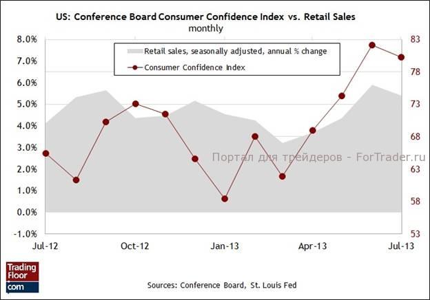 Рост процентных ставок предположительно негативно сказывается на доверии, хотя и в незначительной степени. Согласно опубликованной на прошлой неделе предварительной оценки потребительского доверия от Мичиганского университета за август, настроения среди потребителей стали менее оптимистичными. Аналогичное ухудшение настроений ожидается и в августовском отчете Conference Board, который предлагает конкурирующую оценку.