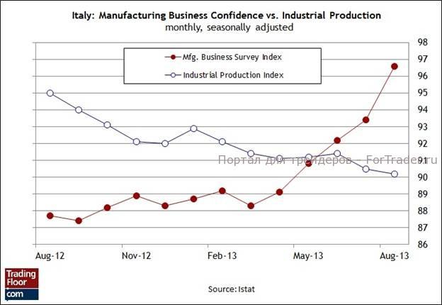 Ранее в этом месяце Банк Италии нашел источники для оптимистичной оценки состояния третьей по величине экономики в Европе. «Появляются первые благоприятные признаки развития итальянской экономики», — заявил ЦБ в своем экономическом бюллетене за октябрь. — «В последние месяцы появились некоторые качественные сигналы для итальянской экономики, что частично обусловлено улучшением экономического цикла в Европе». К другим признакам относятся новости о достойном приросте промышленных продаж на 1% и увеличении новых промышленных заказов на 2% в августе по сравнению с предыдущим месяцем. Можно ли сказать, что это верные сигналы о том, что итальянская экономика, наконец-то, выходит из состояния депрессии?