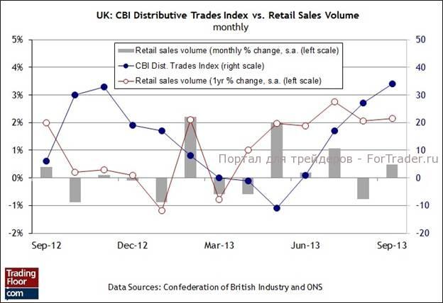 В сентябрьском отчете Конфедерации британской промышленности розничные продажи зафиксировали максимальный прирост за период более одного года. Такой результат, удививший аналитиков, означает возможное улучшение будущих данных от Службы национальной статистики, которая опубликует данные по розничным продажам за октябрь 14 ноября. Поводом для оптимизма в отношении потребительских расходов также стал пятничный отчет о первоначальной оценке роста ВВП за третий квартал, который составил 0,8% — самое высокое значение за три года. «В этих данных по ВВП впечатляет то, что растет не только сектор услуг», — заявил министр финансов Джордж Осборн в интервью каналу BBC на прошлой неделе. — «Укрепляется строительный сектор и сектор обрабатывающей промышленности». Сегодняшний отчет CBI поможет ответить на вопрос о том, применимо ли это к сектору розничных продаж.