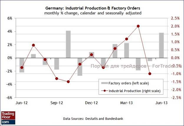 Вчерашняя новость о том, что в июне новые производственные заказы в Германии выросли сильнее, чем ожидалось, зафиксировав максимальный месячный прирост с октября прошлого года, дает некоторым аналитикам основание надеяться на то, что публикуемый на следующей неделе отчет о росте ВВП Германии во втором квартале преподнесет хорошие новости. Сегодняшний отчет о промышленном производстве за июнь придаст новые грани экономической активности в период с апреля по июнь.