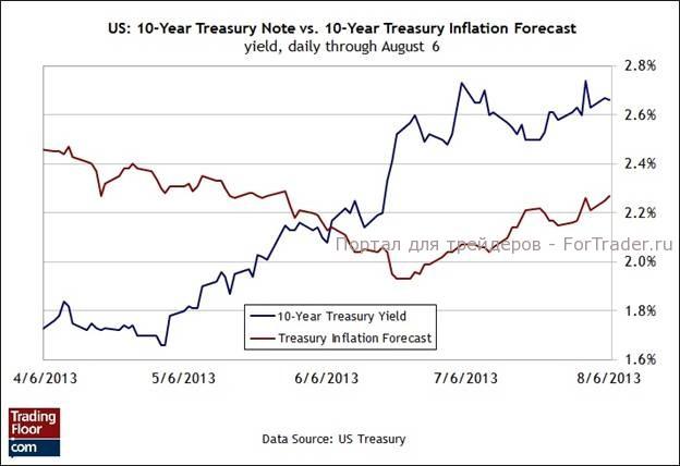 Низкие процентные ставки, действующие на текущий момент, не сопоставимы с умеренным, но устойчивым ростом экономики. В этом заявлении нет ничего нового, но оно приобретает все большее значение по мере того, как поступают данные, свидетельствующие о продолжении подъема в экономике. Опубликованная на прошлой неделе новость о замедлении роста занятости в США в июле вызвала небольшое разочарование на рынке, но учитывая, что самое страшное в сокращении бюджета федерального правительства уже позади, верить в дальнейший рост становится намного легче. Действительно, в июле оценки настроений на основании индексов ISM в производственном секторе и секторе услуг существенно превысили прогнозы, и это является хорошим знаком для развития экономики во второй половине этого года. Однако это также означает, что ФРС начнет сворачивать меры по стимулированию экономики раньше, чем ожидалось.