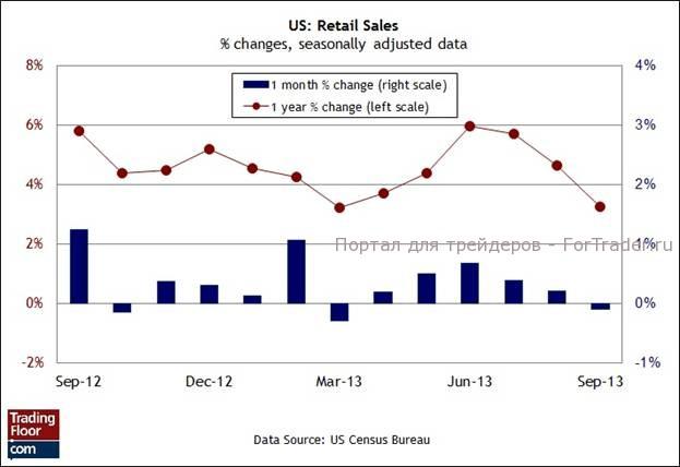 В последние несколько месяцев розничные продажи снижались, поэтому в отчете за октябрь участники рынка будут искать ответа на вопрос, что означают такие неутешительные данные: временное отклонение или что-то более серьезное. На сегодняшний день ситуация в сегменте потребительских расходов крайне неопределенная. Эта неясность может усилиться по причине того, что в сегодняшнем отчете может быть отражена искаженная картина в связи с закрытием правительства в отчетном месяце.