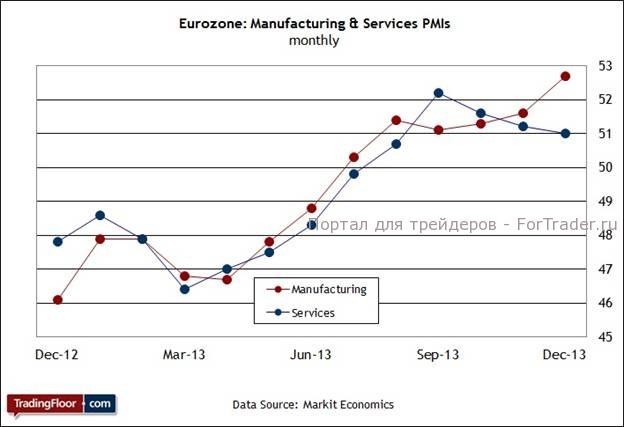 Насколько неравномерным? На этот вопрос помогут ответить предварительные данные об активности в производственном секторе и секторе услуг за январь, которые выходят сегодня. В окончательном отчете за декабрь композитный индекс PMI для еврозоны, составляемый компанией Markit, повысился, приблизившись к максимальному за два с половиной года значению. Производственный сектор показал наилучшие результаты роста, зафиксировав самое высокое значение с мая 2011 года. Но обратите внимание на компонент сектора услуг в этом уравнении: хотя этот сегмент экономики продолжает развиваться, темпы роста опустились до минимального за четыре месяца уровня. Тем не менее, экономисты полагают, что в сегодняшнем выпуске предварительных оценок для ЕС индексы немного повысятся. В этом случае окажется, что МВФ был прав, когда повышал свои ожидания в отношении роста в Европе в 2014 году.