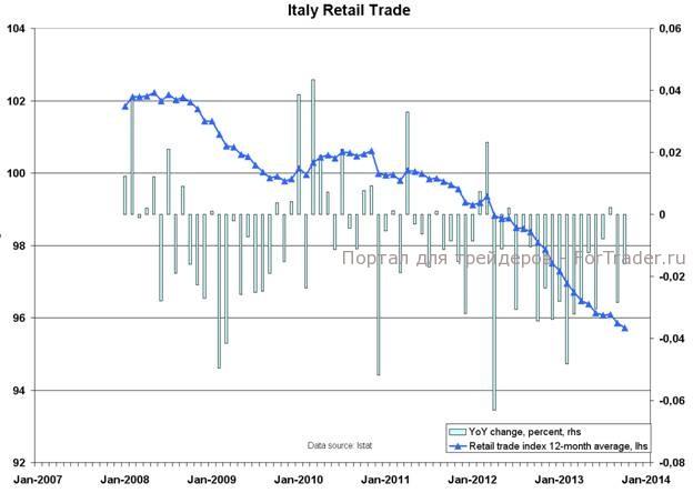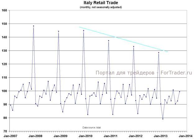 Объемы в розничном секторе Италии были невысокими на протяжении всего кризиса в еврорегионе. По последним данным за октябрь, розничная торговля сократилась на 1,6% по сравнению с предыдущим годом, и рост еще долгое время будет очень слабым. Если посмотреть на месячные результаты (без учета сезонных факторов), то на общем фоне отчетливо выделяется декабрь благодаря возрастающим объемам торговли в период Рождества и Нового года. В то время как в последние несколько лет продажи в течение большинства месяцев оставались практически неизменными, декабрьские результаты пострадали больше всего. Если прошлые сезонные модели сохранятся, то в ноябре результат продаж должен быть низким, затем рост в декабре, за которым последуют два месяца стремительно падающих продаж. Несмотря на улучшение потребительских настроений в Италии, на расходах в розничном секторе это никак не сказалось. Уровень декабрьских продаж должен стать хорошим индикатором отечественной экономики. Скоро мы узнаем, продолжится ли нисходящий тренд.