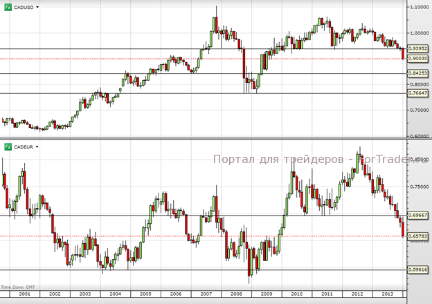 На заседании по монетарной политике, которое состоялось в прошлую среду, Банк Канады решил оставить процентную ставку без изменений на уровне 1%, но заявил о своей растущей обеспокоенности по поводу низкой инфляции и высокого курса канадского доллара, который негативно влияет на эффективность экспортного сектора страны. Так обычно говорит центральный банк, который настроен на смягчение условий денежно-кредитной политики, и рынки сделали логический вывод о том, что Банк Канады может понизить уровень процентной ставки. Следующее заседание Банка Канады состоится 5 марта. С предыдущим отчетом об инфляции можно ознакомиться здесь. В условиях инфляции на уровне 1% только рынок недвижимости сдерживает снижение ставки. К счастью, сворачивание стимулирующих мер в США и, как следствие, повышение долгосрочных процентных ставок способствовали также росту ипотечных ставок, что позволит Банку Канады дополнительно смягчить условия. Канадский доллар за последнее время довольно сильно понизился наряду с валютами других стран-производителей сырья. В паре канадский доллар/доллар США остается еще достаточно места для снижения.